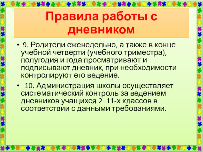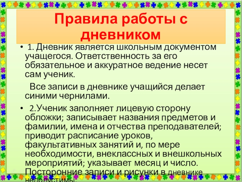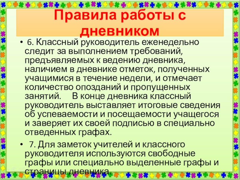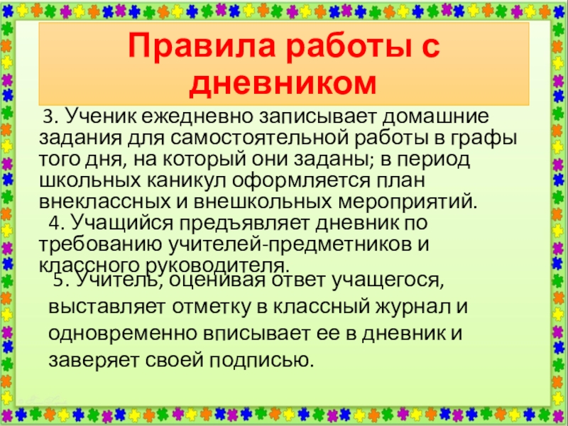 5. Учитель, оценивая ответ учащегося, выставляет отметку в классный журнал и одновременно вписывает ее в дневник и заверяет своей подписью.