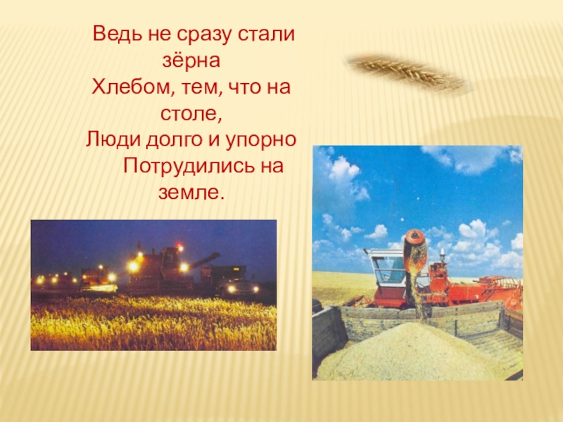 Ведь не сразу стали зёрнаХлебом, тем, что на столе, Люди долго и упорно   Потрудились