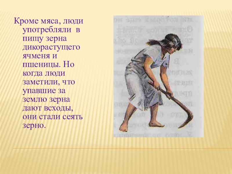 Слайд 6Кроме мяса, люди употребляли в пищу зерна дикорастущего ячменя и пшеницы.