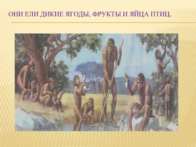 Слайд 5Они ели дикие ягоды, фрукты и яйца птиц.