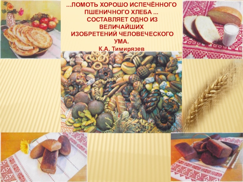 ...ЛОМОТЬ ХОРОШО ИСПЕЧЁННОГО ПШЕНИЧНОГО ХЛЕБА ... СОСТАВЛЯЕТ ОДНО ИЗ ВЕЛИЧАЙШИХ ИЗОБРЕТЕНИЙ ЧЕЛОВЕЧЕСКОГО УМА.К.А. Тимирязев