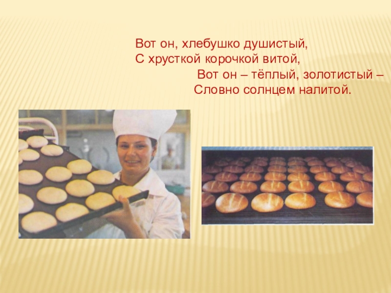 Вот он, хлебушко душистый,С хрусткой корочкой витой,   		 Вот он – тёплый, золотистый –