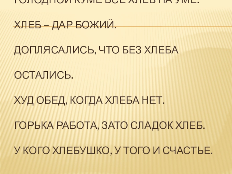 Слайд 19 Голодной куме все хлеб на уме. Хлеб – дар божий. Доплясались, что без