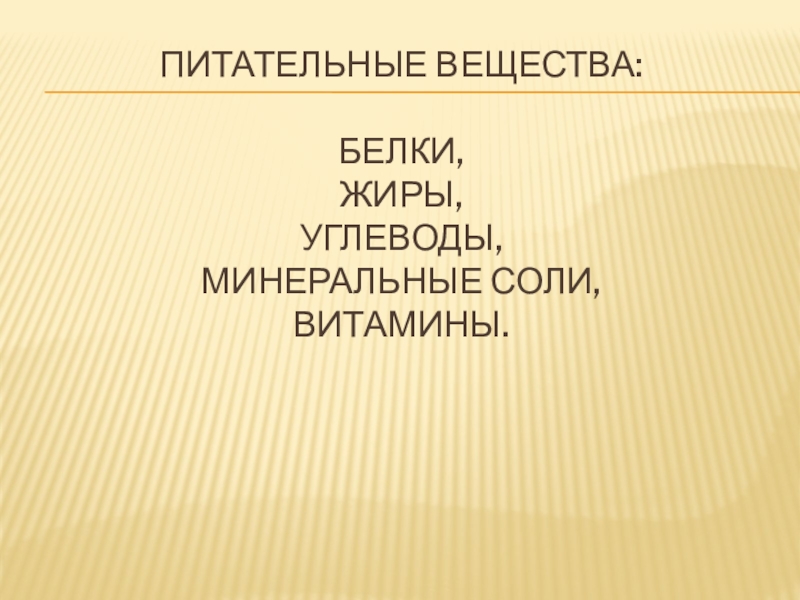 Слайд 13 Питательные вещества: Белки, жиры, углеводы, минеральные соли, витамины.