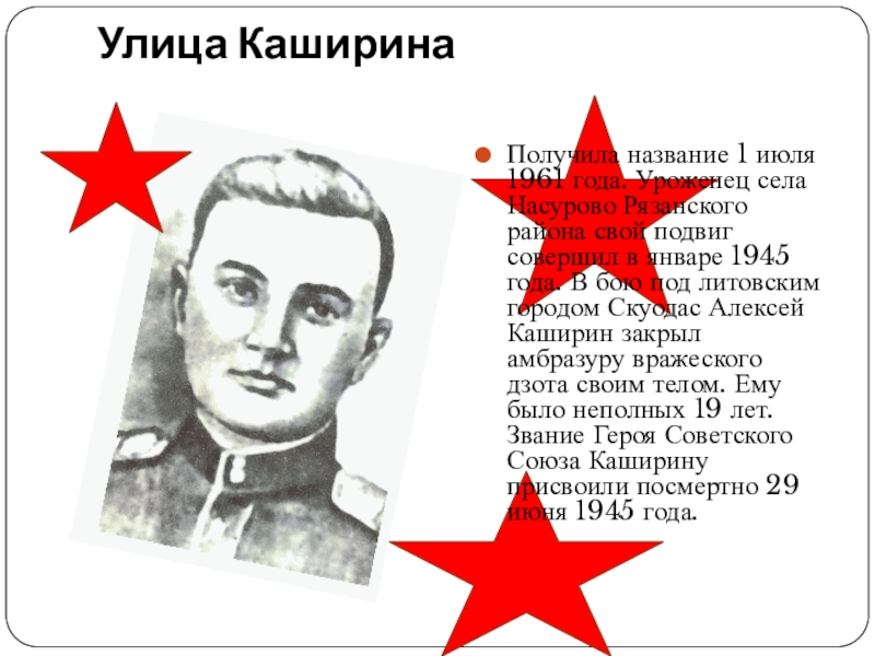 района свой подвиг совершил в январе 1945 года. В бою под литовским городом Скуодас Алексей Каширин закрыл амбразуру вражеского дзота своим телом. Ему было неполных 19 лет. Звание Героя Советского Союза Каширину присвоили посмертно 29 июня 1945 года.