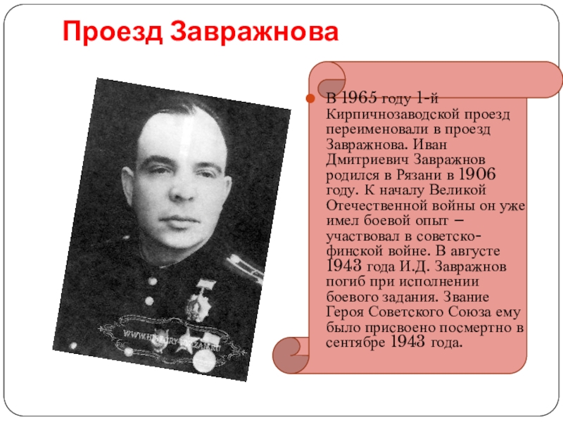 Иван Дмитриевич Завражнов родился в Рязани в 1906 году. К началу Великой Отечественной войны он уже имел боевой опыт – участвовал в советско-финской войне. В августе 1943 года И.Д. Завражнов погиб при исполнении боевого задания. Звание Героя Советского Союза ему было присвоено посмертно в сентябре 1943 года.