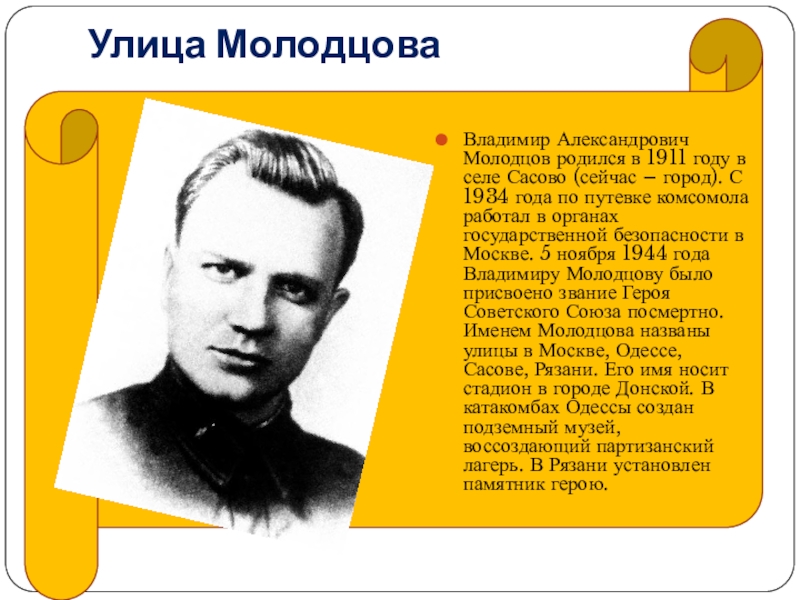 (сейчас – город). С 1934 года по путевке комсомола работал в органах государственной безопасности в Москве. 5 ноября 1944 года Владимиру Молодцову было присвоено звание Героя Советского Союза посмертно. Именем Молодцова названы улицы в Москве, Одессе, Сасове, Рязани. Его имя носит стадион в городе Донской. В катакомбах Одессы создан подземный музей, воссоздающий партизанский лагерь. В Рязани установлен памятник герою.