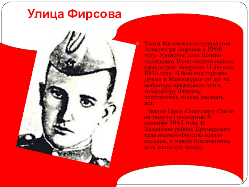 Улица Касимовка получила имя Александра Фирсова в 1966 году. Уроженец