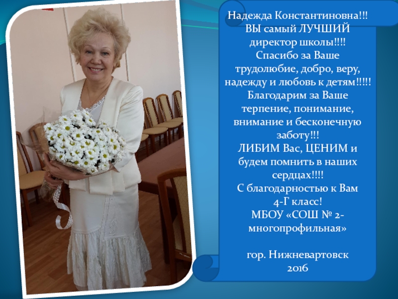 Надежда Константиновна!!!ВЫ самый ЛУЧШИЙ директор школы!!!!Спасибо за Ваше трудолюбие, добро, веру, надежду и любовь к детям!!!!!Благодарим за Ваше терпение, понимание, внимание и бесконечную заботу!!!ЛИБИМ Вас, ЦЕНИМ и будем помнить в наших сердцах!!!!С благодарностью к Вам 4-Г