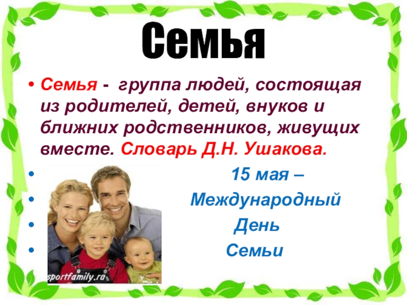 Семья Семья -  группа людей, состоящая из родителей, детей, внуков и ближних родственников, живущих вместе. Словарь Д.Н.