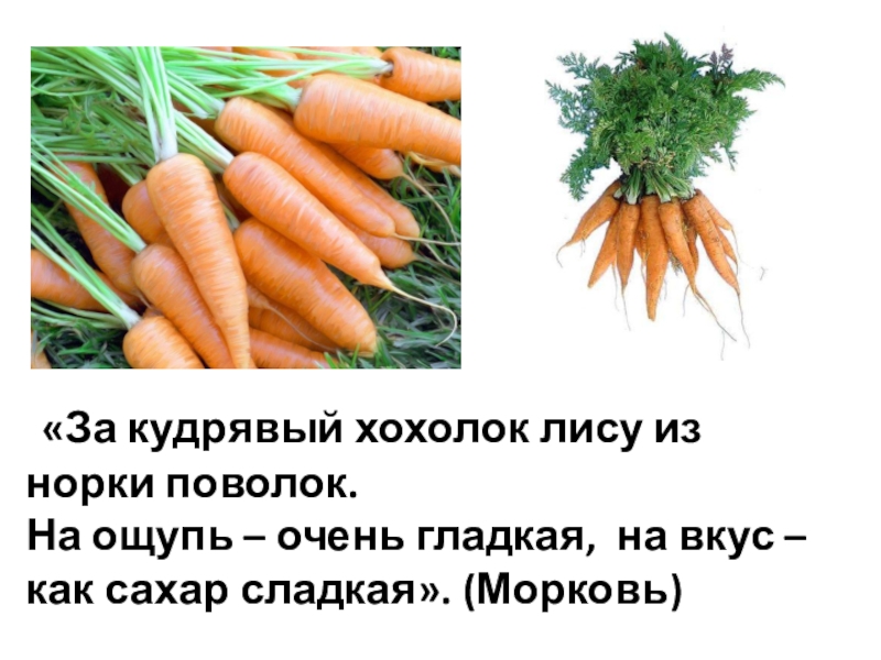 «За кудрявый хохолок лису из норки поволок.На ощупь – очень гладкая,  на вкус – как сахар сладкая». (Морковь)