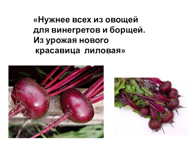 «Нужнее всех из овощейдля винегретов и борщей.Из урожая нового красавица  лиловая»