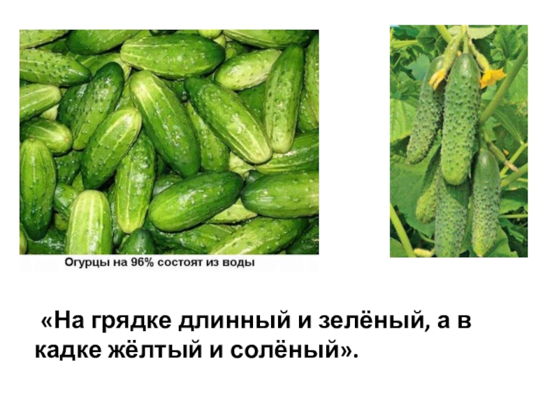 Слайд 10  «На грядке длинный и зелёный, а в кадке жёлтый и солёный».