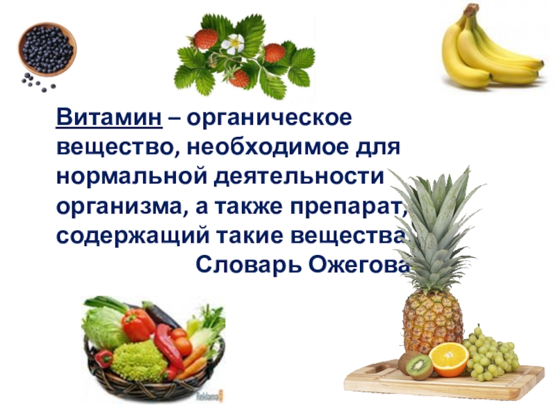 Витамин – органическое вещество, необходимое для нормальной деятельности организма, а также препарат, содержащий такие вещества.                         Словарь Ожегова