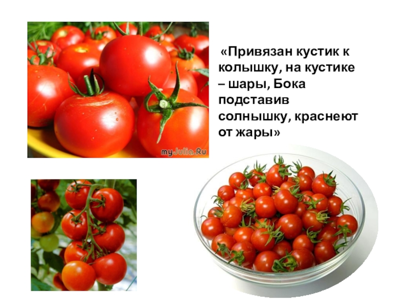 «Привязан кустик к колышку, на кустике – шары, Бока подставив солнышку, краснеют от жары»