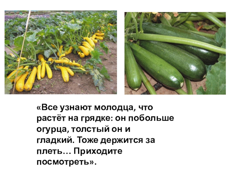 «Все узнают молодца, что растёт на грядке: он побольше огурца, толстый он и гладкий. Тоже держится за плеть… Приходите посмотреть».