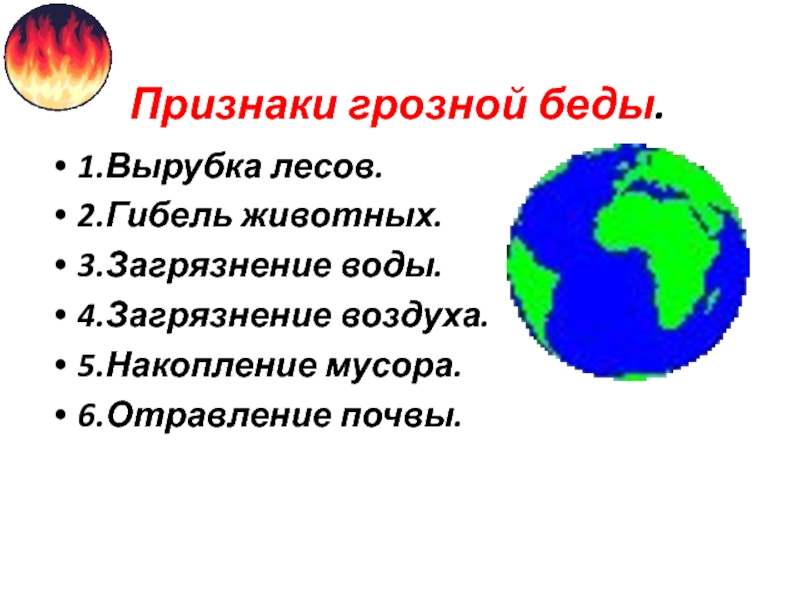 Признаки грозной беды. 1.Вырубка лесов.2.Гибель животных.3.Загрязнение воды.4.Загрязнение воздуха.5.Накопление мусора.6.Отравление почвы.