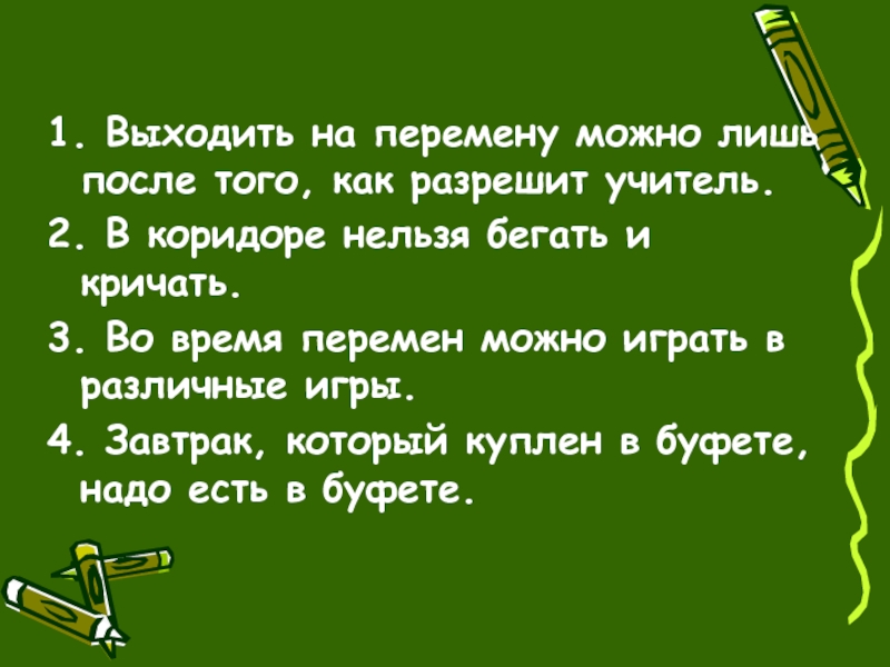 1. Выходить на перемену можно лишь после того, как разрешит учитель.2. В коридоре нельзя бегать и кричать.3.