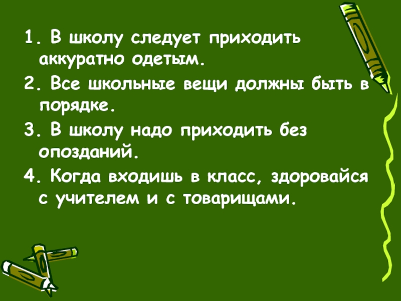 1. В школу следует приходить аккуратно одетым.2. Все школьные вещи должны быть в порядке.3. В школу надо