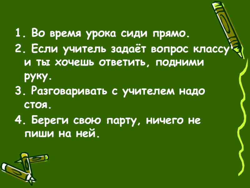 1. Во время урока сиди прямо.2. Если учитель задаёт вопрос классу и ты хочешь ответить, подними руку.3.