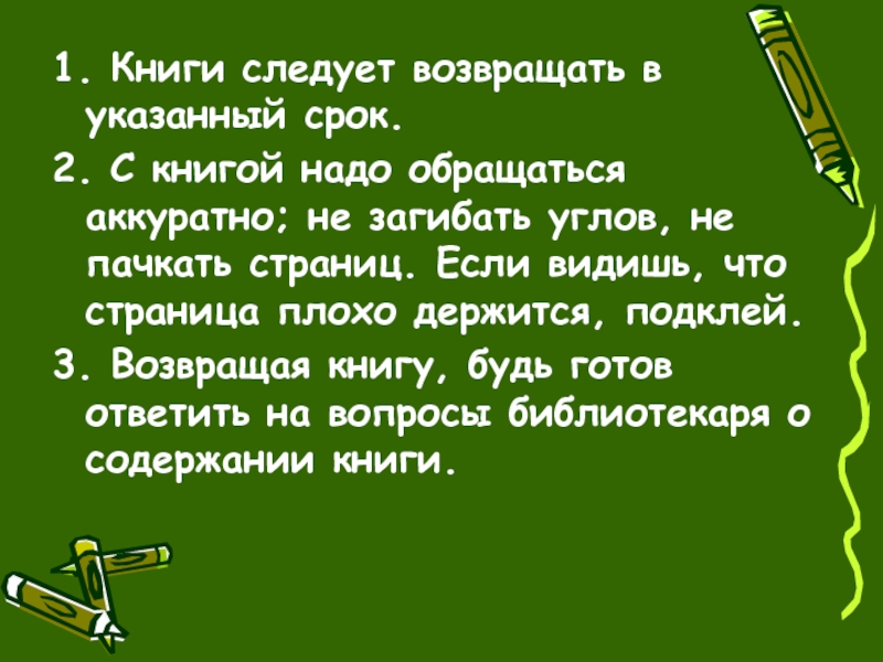 1. Книги следует возвращать в указанный срок.2. С книгой надо обращаться аккуратно; не загибать углов, не пачкать