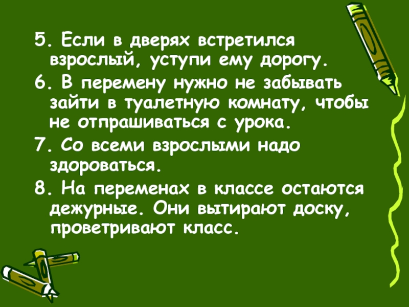 5. Если в дверях встретился взрослый, уступи ему дорогу.6. В перемену нужно не забывать зайти в туалетную