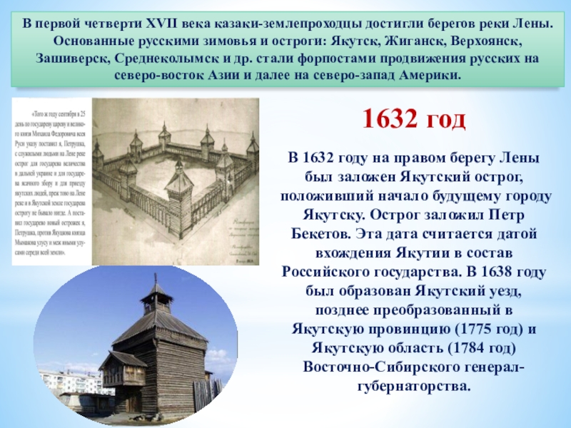 В 1632 году на правом берегу Лены был заложен Якутский острог, положивший начало будущему городу Якутску. Острог заложил Петр Бекетов. Эта дата считается датой вхождения Якутии в состав Российского государства. В 1638 году был образован Якутский уезд, позднее преобразованный в Якутскую провинцию (1775 год) и Якутскую область (1784 год) Восточно-Сибирского генерал-губернаторства.