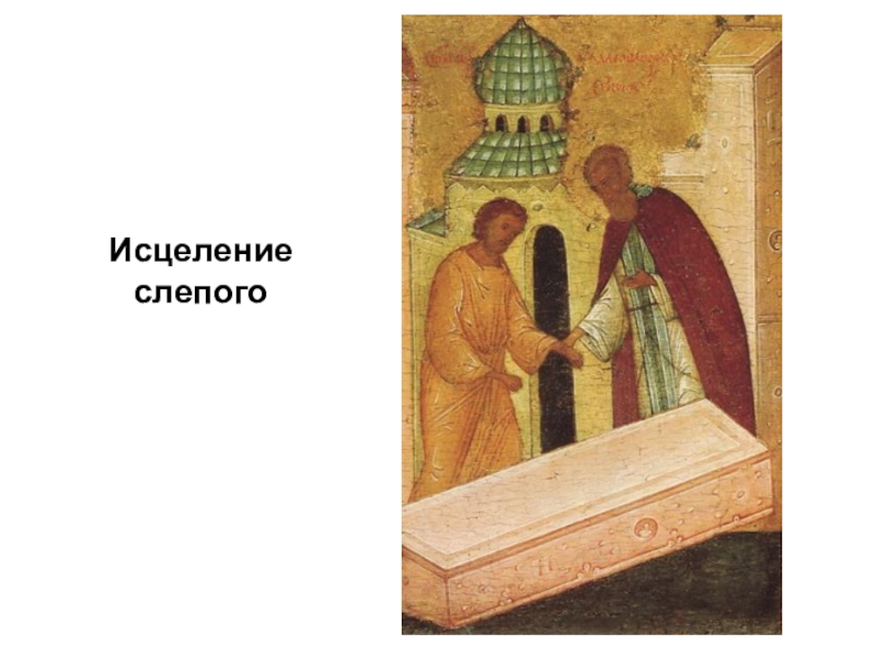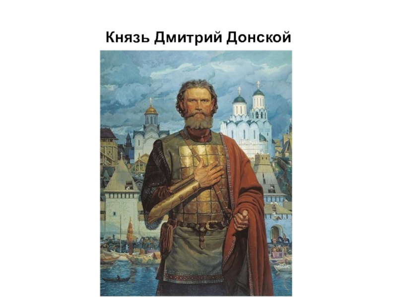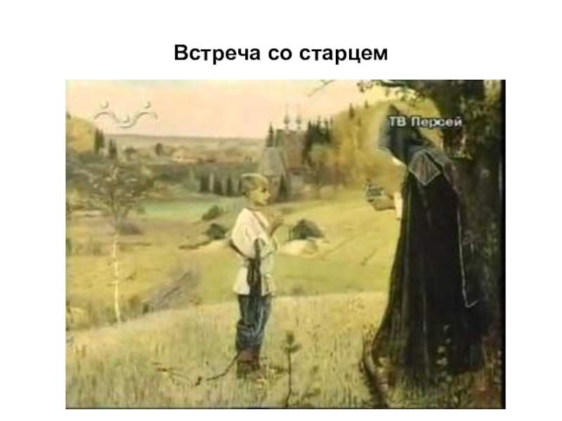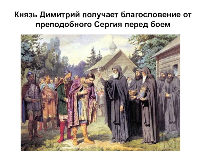 Слайд 32Князь Димитрий получает благословение от преподобного Сергия перед боем
