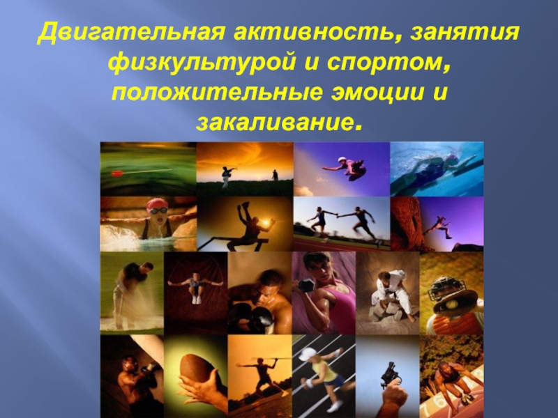 Слайд 12Двигательная активность, занятия физкультурой и спортом, положительные эмоции и закаливание.
