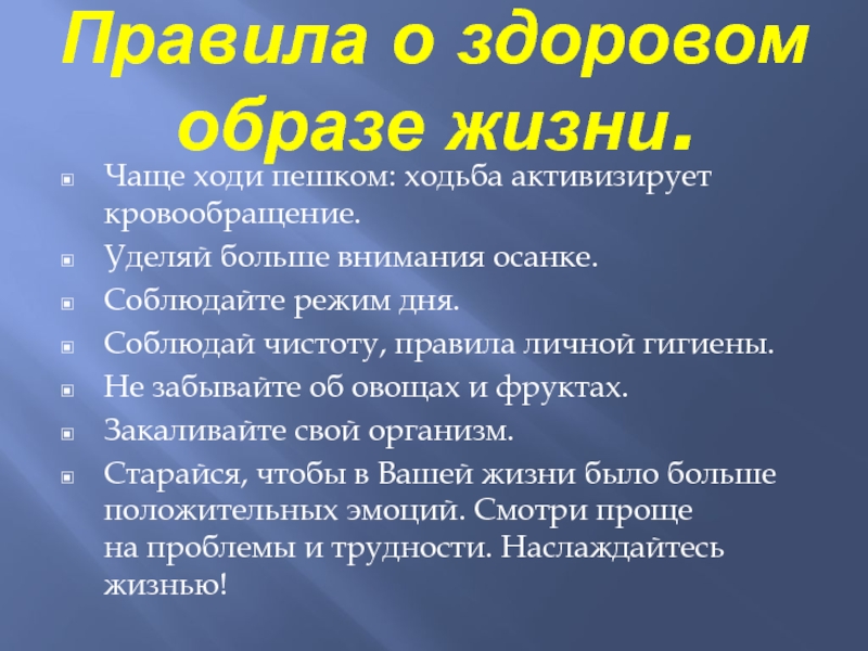 Правила о здоровом образе жизни. Чаще ходи пешком: ходьба активизирует кровообращение. Уделяй больше внимания осанке.Соблюдайте режим дня. Соблюдай чистоту, правила личной гигиены. Не забывайте об овощах и фруктах. Закаливайте свой организм. Старайся, чтобы в Вашей жизни было больше положительных эмоций. Смотри