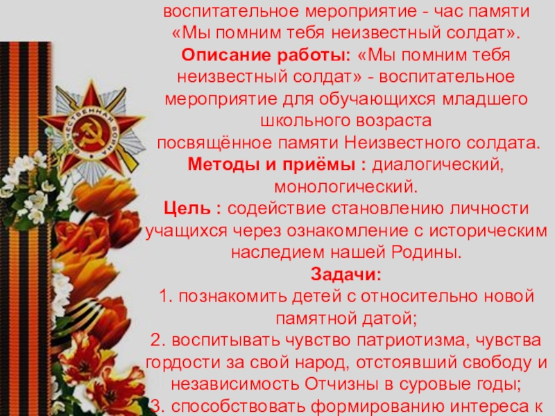 «Мы помним тебя неизвестный солдат». Описание работы: «Мы помним тебя неизвестный солдат» - воспитательное мероприятие для обучающихся младшего школьного возраста посвящённое памяти Неизвестного солдата. Методы и приёмы : диалогический, монологический. Цель : содействие становлению личности учащихся через ознакомление с историческим наследием нашей Родины. Задачи: 1. познакомить детей с относительно новой памятной датой; 2. воспитывать чувство патриотизма, чувства гордости за свой народ, отстоявший свободу и независимость Отчизны в суровые годы; 3. способствовать формированию интереса к истории России и своей малой Родины. Оборудование: - ноутбук.