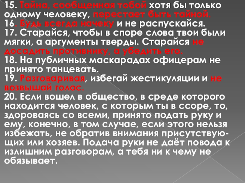 20. Если вошел в общество, в среде которого находится человек, с которым ты в ссоре, то, здороваясь со всеми, принято подать руку и ему, конечно, в том случае, если этого нельзя избежать, не обратив внимания присутствую-щих или хозяев. Подача руки не даёт повода к излишним разговорам, а тебя ни к чему не обязывает.