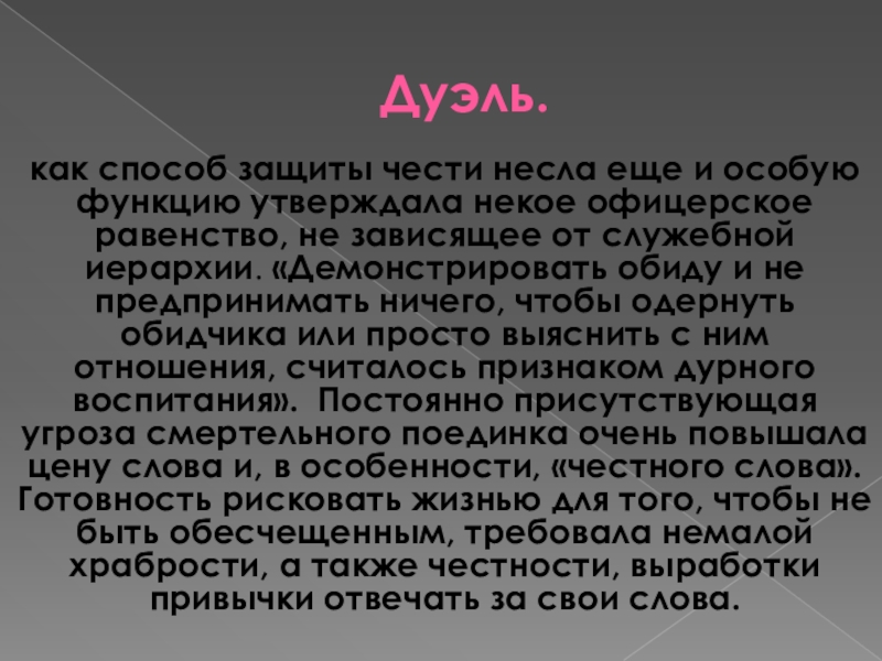 офицерское равенство, не зависящее от служебной иерархии. «Демонстрировать обиду и не предпринимать ничего, чтобы одернуть обидчика или просто выяснить с ним отношения, считалось признаком дурного воспитания». Постоянно присутствующая угроза смертельного поединка очень повышала цену слова и, в особенности, «честного слова». Готовность рисковать жизнью для того, чтобы не быть обесчещенным, требовала немалой храбрости, а также честности, выработки привычки отвечать за свои слова.