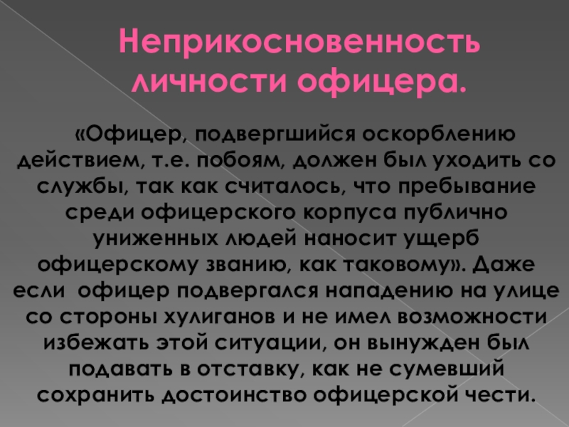 был уходить со службы, так как считалось, что пребывание среди офицерского корпуса публично униженных людей наносит ущерб офицерскому званию, как таковому». Даже если офицер подвергался нападению на улице со стороны хулиганов и не имел возможности избежать этой ситуации, он вынужден был подавать в отставку, как не сумевший сохранить достоинство офицерской чести.