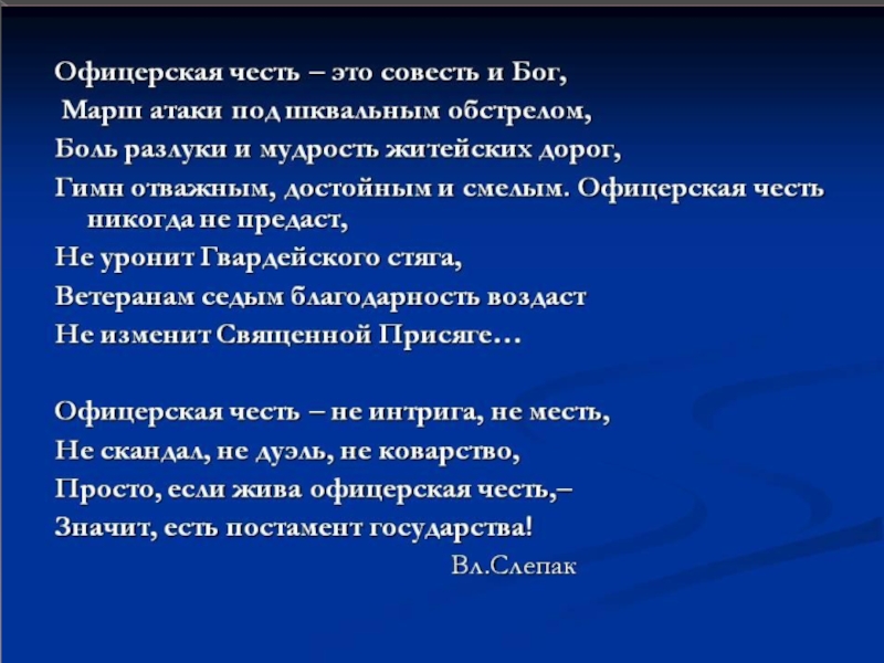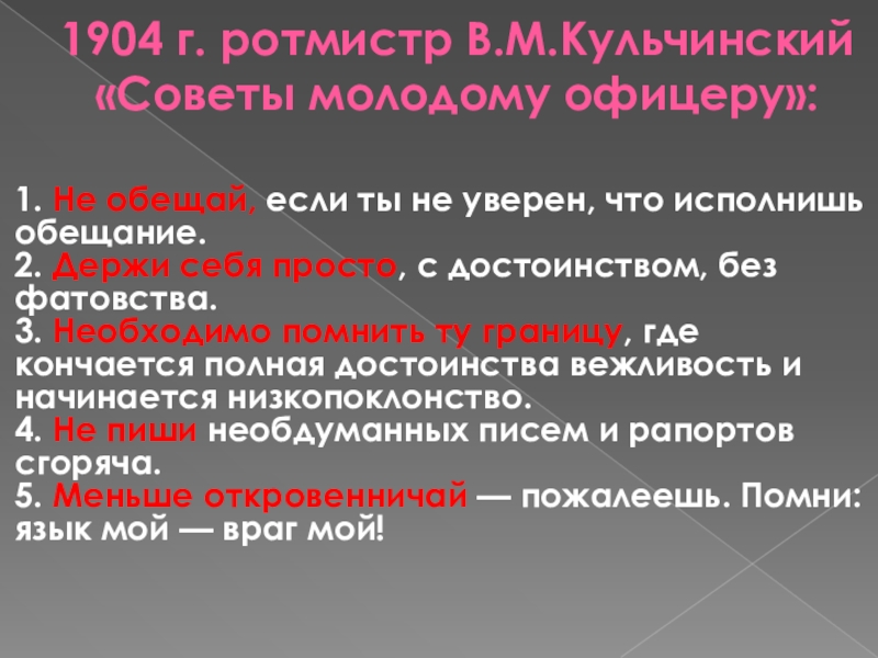 «Слово офицера должно быть залогом правды, и потому ложь, хвастовство, неисполнение обязательства - пороки, подрывающие веру в правдивость офицера, вообще бесчестят офицерское звание и не могут быть терпимы» -генерал-лейтенант Э.Ф. Свидзинский