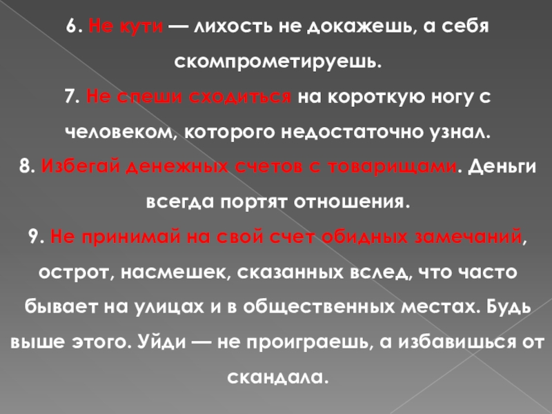 9. Не принимай на свой счет обидных замечаний, острот, насмешек, сказанных вслед, что часто бывает на улицах и в общественных местах. Будь выше этого. Уйди — не проиграешь, а избавишься от скандала.