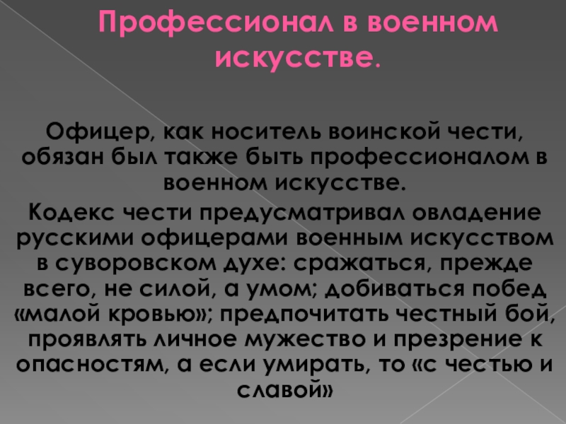 Кодекс чести предусматривал овладение русскими офицерами военным искусством в суворовском духе: сражаться, прежде всего, не силой, а умом; добиваться побед «малой кровью»; предпочитать честный бой, проявлять личное мужество и презрение к опасностям, а если умирать, то «с честью и славой»