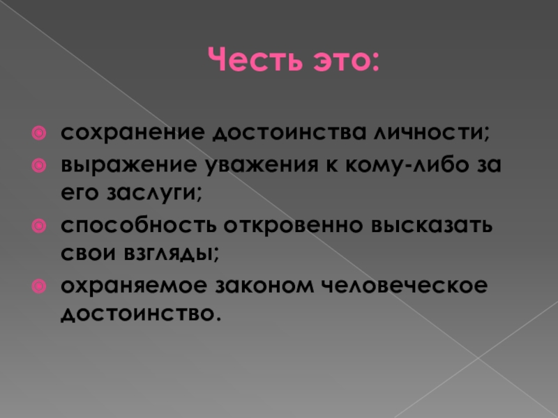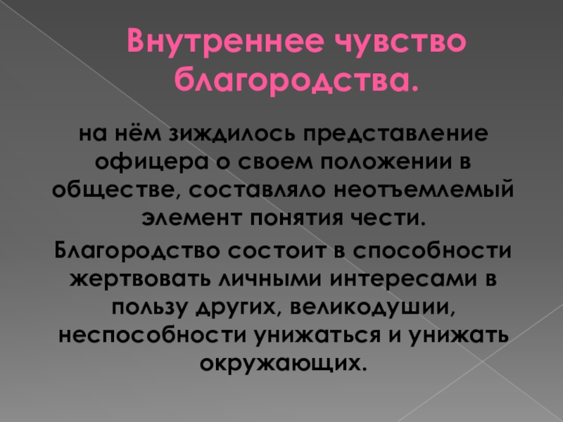 включает внутреннее благородство, честность, истинное честолюбие, глубокое чувство долга,