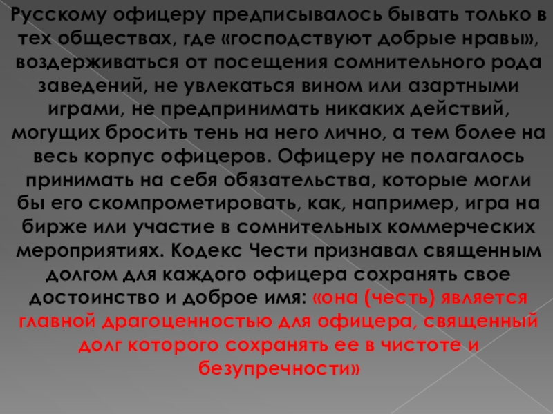 нравы», воздерживаться от посещения сомнительного рода заведений, не увлекаться вином или азартными играми, не предпринимать никаких действий, могущих бросить тень на него лично, а тем более на весь корпус офицеров. Офицеру не полагалось принимать на себя обязательства, которые могли бы его скомпрометировать, как, например, игра на бирже или участие в сомнительных коммерческих мероприятиях. Кодекс Чести признавал священным долгом для каждого офицера сохранять свое достоинство и доброе имя: «она (честь) является главной драгоценностью для офицера, священный долг которого сохранять ее в чистоте и безупречности»