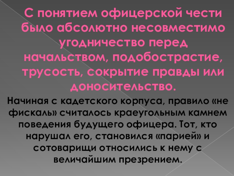 Слайд 19С понятием офицерской чести было абсолютно несовместимо угодничество перед начальством, подобострастие,