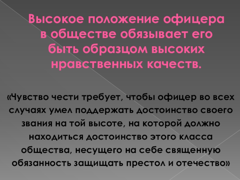 Слайд 11Высокое положение офицера в обществе обязывает его быть образцом высоких нравственных