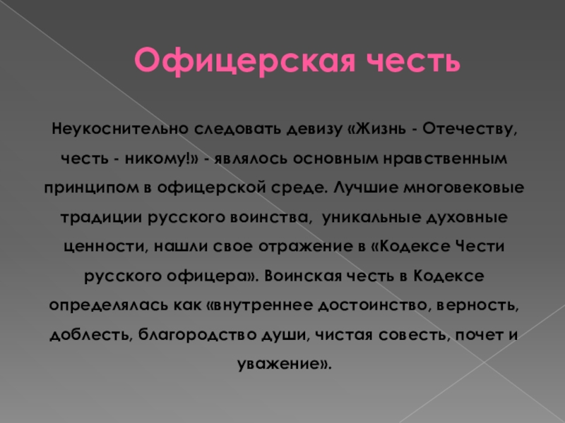 являлось основным нравственным принципом в офицерской среде. Лучшие многовековые традиции русского воинства, уникальные духовные ценности, нашли свое отражение в «Кодексе Чести русского офицера». Воинская честь в Кодексе определялась как «внутреннее достоинство, верность, доблесть, благородство души, чистая совесть, почет и уважение».