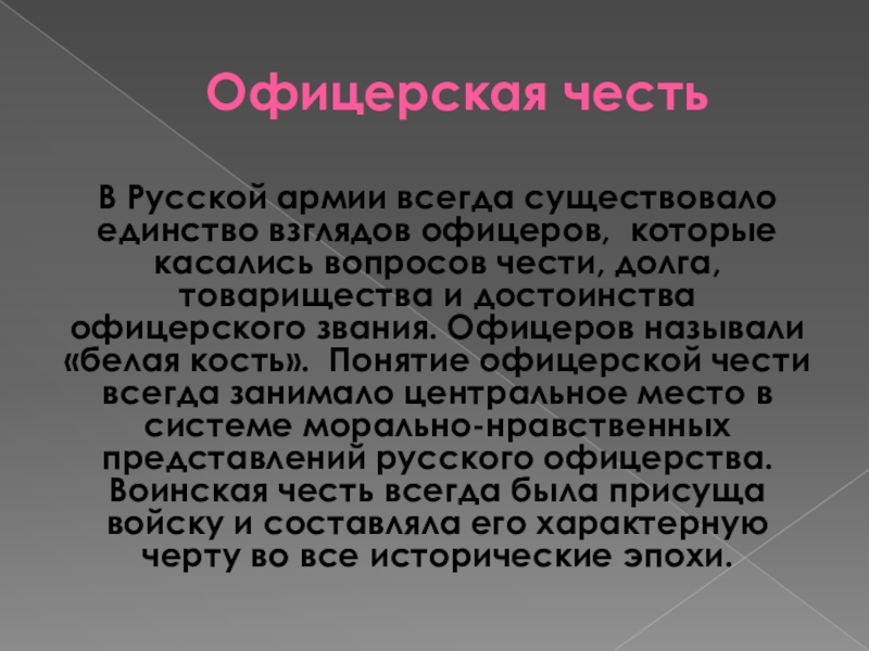 вопросов чести, долга, товарищества и достоинства офицерского звания. Офицеров называли «белая кость». Понятие офицерской чести всегда занимало центральное место в системе морально-нравственных представлений русского офицерства. Воинская честь всегда была присуща войску и составляла его характерную черту во все исторические эпохи.