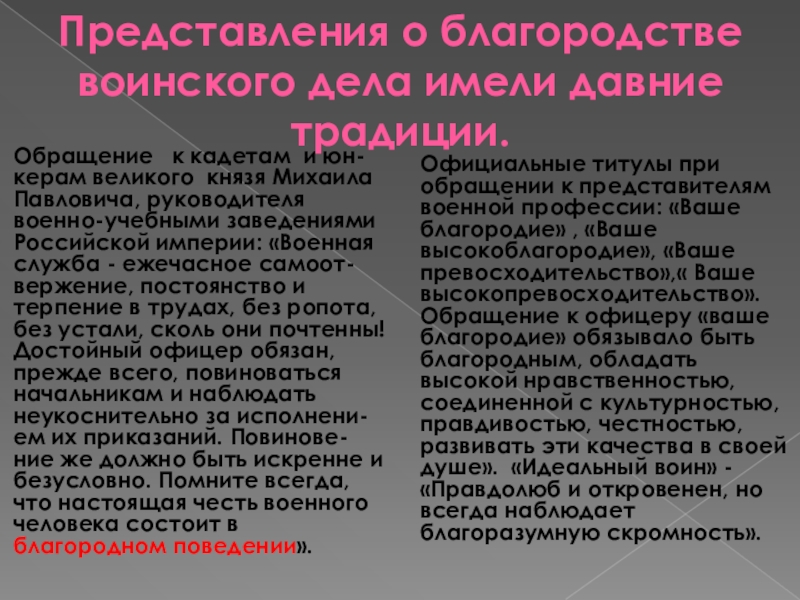 Официальные титулы при обращении к представителям военной профессии: «Ваше благородие» , «Ваше высокоблагородие», «Ваше превосходительство»,« Ваше высокопревосходительство». Обращение к офицеру «ваше благородие» обязывало быть благородным, обладать высокой нравственностью, соединенной с культурностью, правдивостью, честностью, развивать эти качества в своей душе». «Идеальный воин» - «Правдолюб и откровенен, но всегда наблюдает благоразумную скромность».