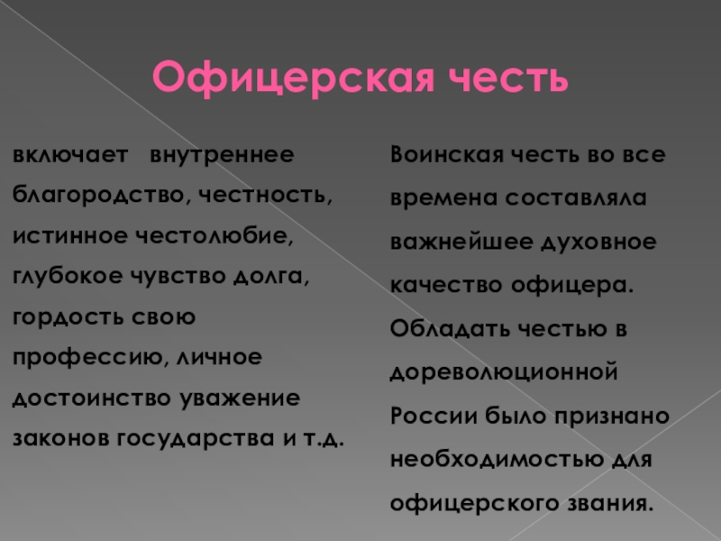Воинская честь во все времена составляла важнейшее духовное качество офицера. Обладать честью в дореволюционной России было признано необходимостью для офицерского звания.