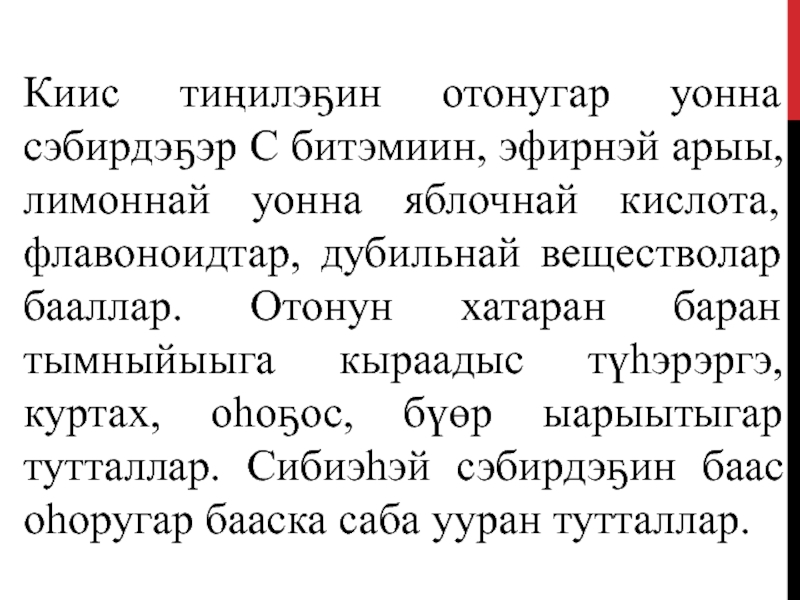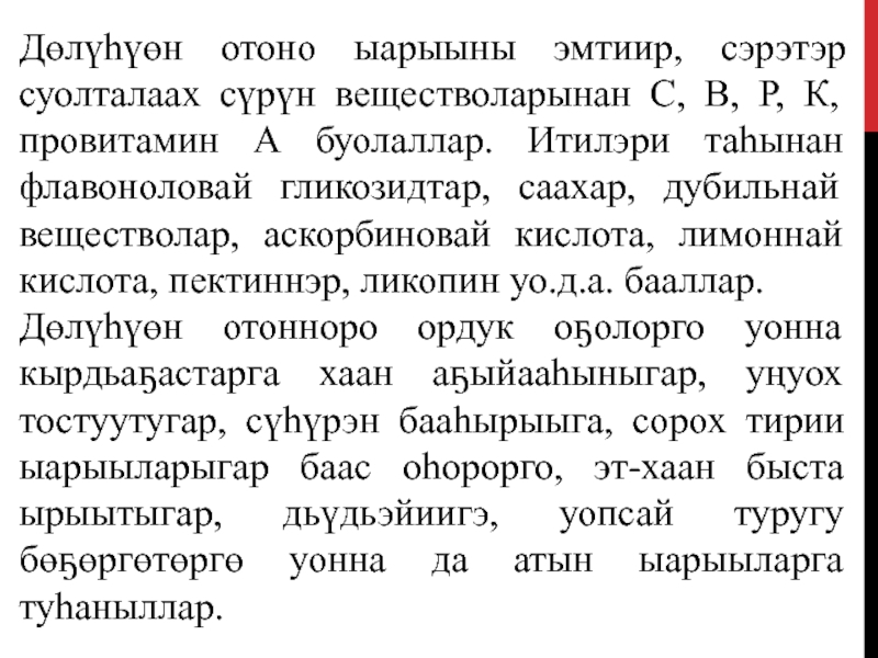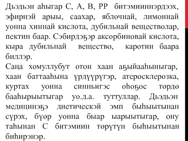 Слайд 12Дьэдьэн аһыгар С, А, В, РР битэмииннэрдээх, эфирнэй арыы, саахар, яблочнай,