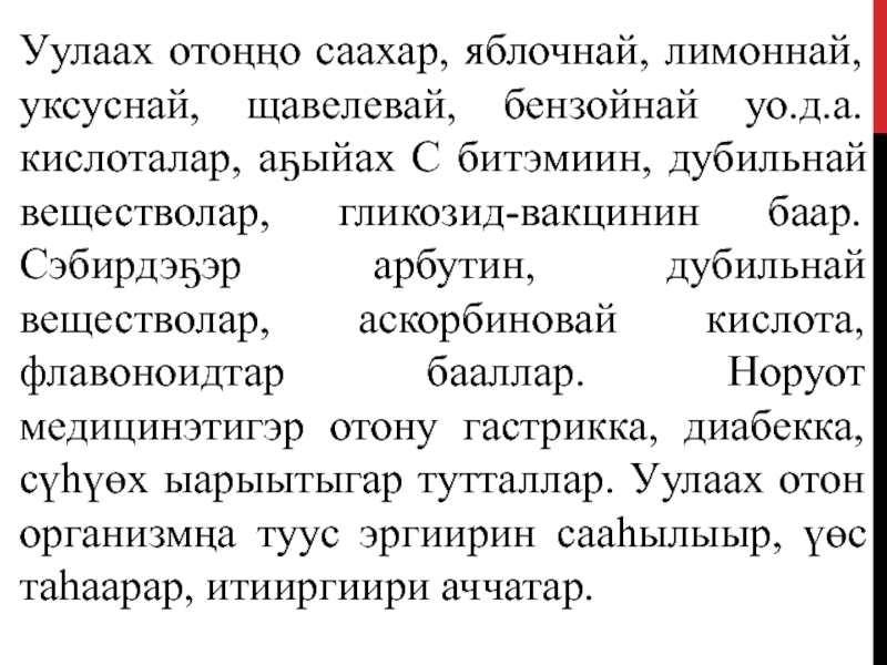 Слайд 29Уулаах отоңңо саахар, яблочнай, лимоннай, уксуснай, щавелевай, бензойнай уо.д.а. кислоталар, аҕыйах