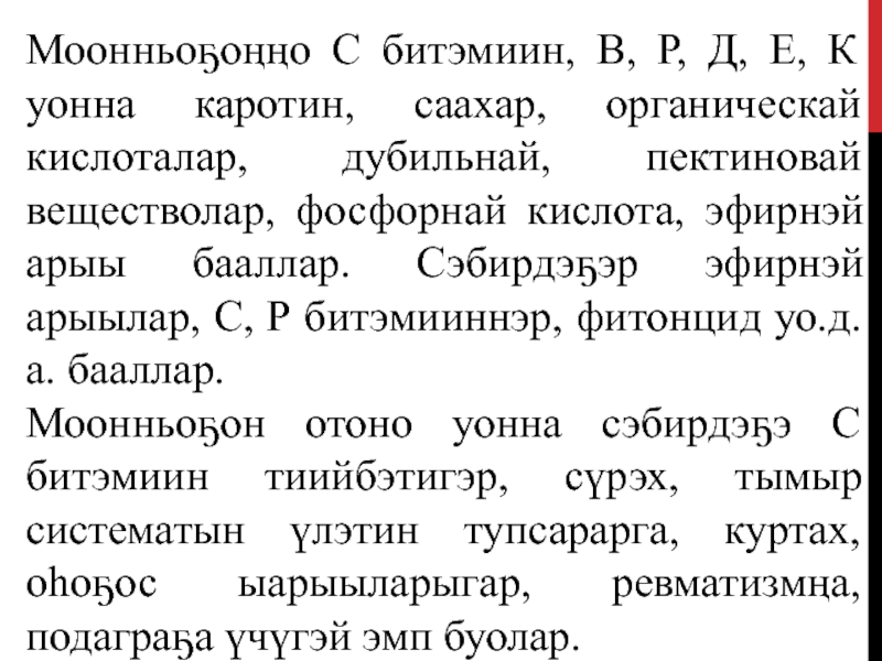 Слайд 23Моонньоҕоңңо С битэмиин, В, Р, Д, Е, К уонна каротин, саахар,