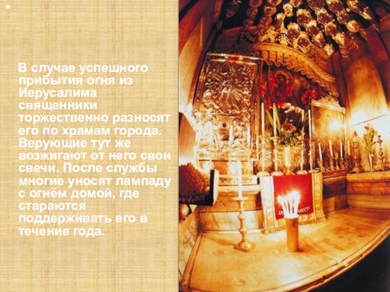 торжественно разносят его по храмам города. Верующие тут же возжигают от него свои свечи. После службы многие уносят лампаду с огнём домой, где стараются поддерживать его в течение года.