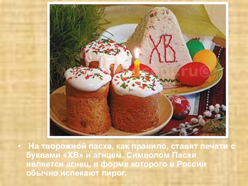 На творожной пасхе, как правило, ставят печати с буквами «ХВ» и агнцем. Символом Пасхи является агнец,